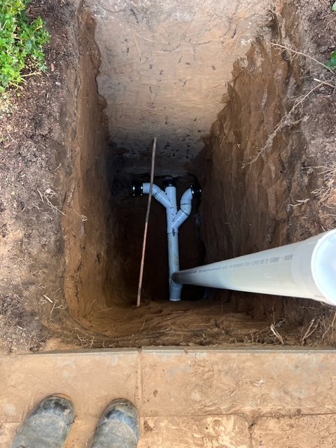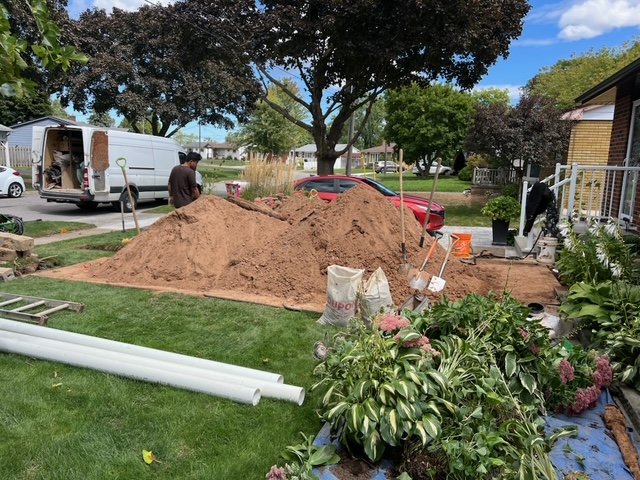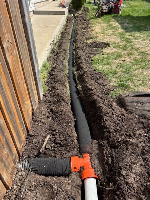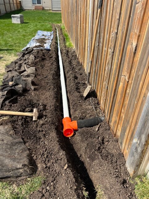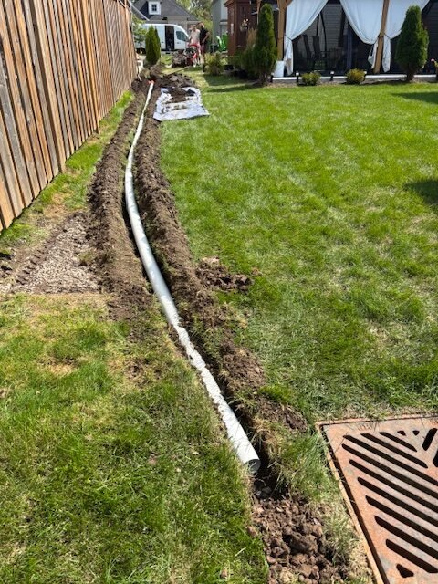 Preparing the yard for a full drainage upgrade — new piping routed away from the foundation to keep water from pooling near the home.