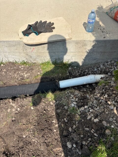Exterior drain repair in progress – replacing a damaged weeping tile and connecting new PVC drainage to prevent basement water seepage.