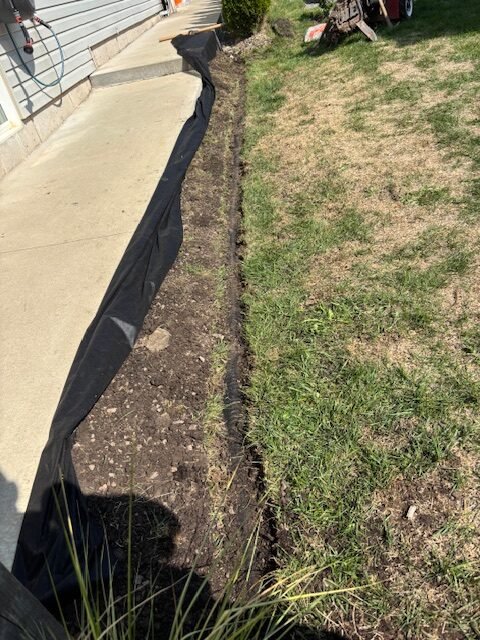 Drainage trench lined and prepared for final pipe placement to control runoff along the side of the home.