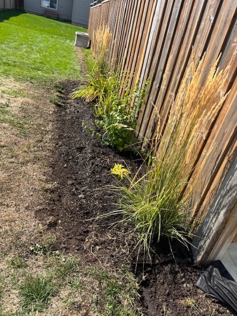 New drainage line set into position — improving backyard water flow and preventing pooling near the fence.