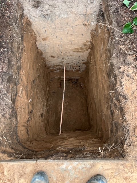 Deep trench excavated to access the existing sanitary system and prepare for new piping installation.